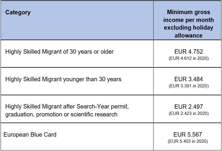 From 1 january 2021 the gross monthly salary thresholds, excluding 8 percent holiday pay, will be as follows: In 2024, the minimum monthly gross salary for a highly skilled migrant age 30 or older is eur 5,331.